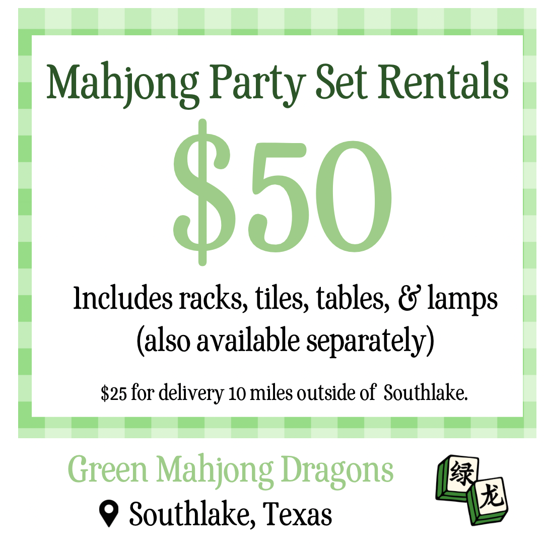 If you’re looking to host a Mahjong event of your own we’ve got you covered with supplies! Our inventory consists of: